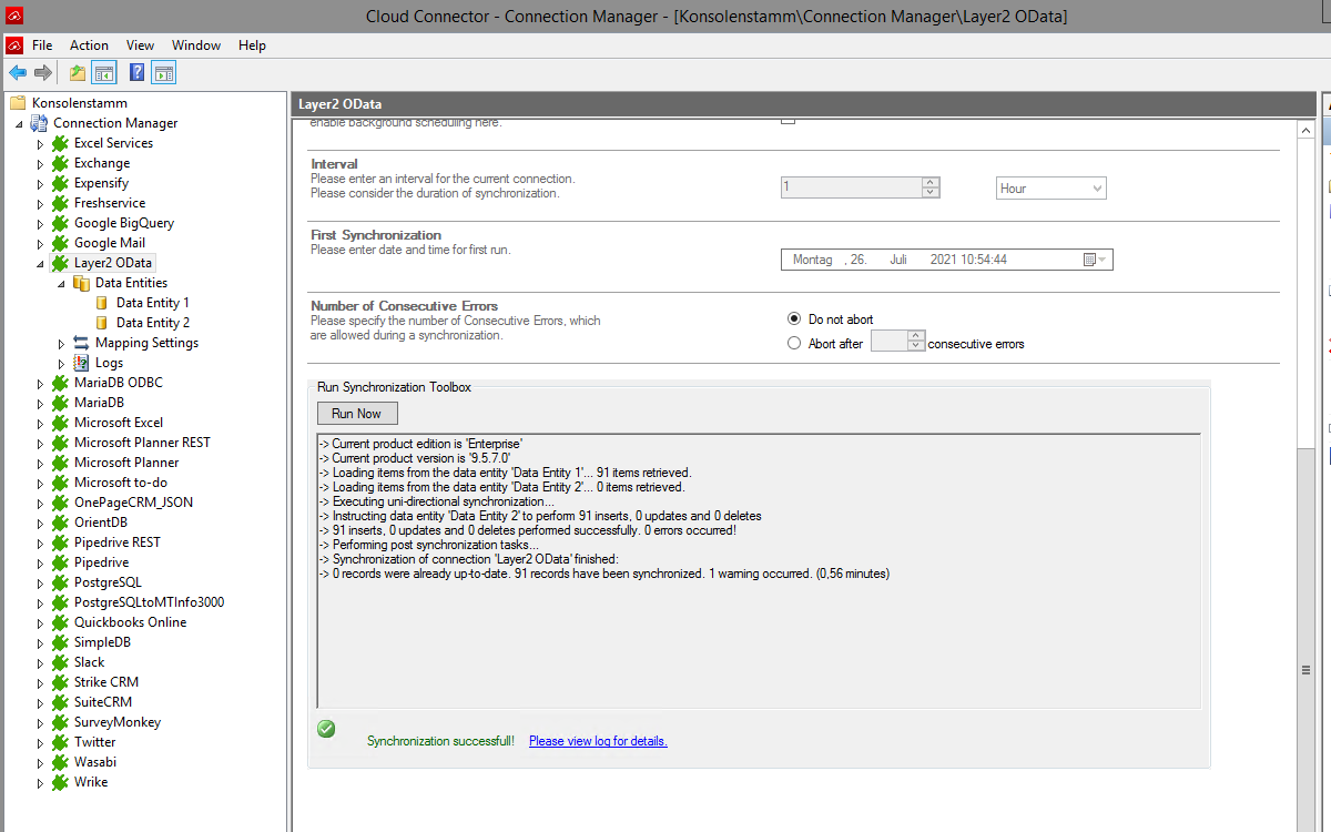 To run your connection switch back to the main connection configuration node and use the Run Now Button located on the bottom of the setup page. The Run Synchronization Toolbox will also display the synchronization process.